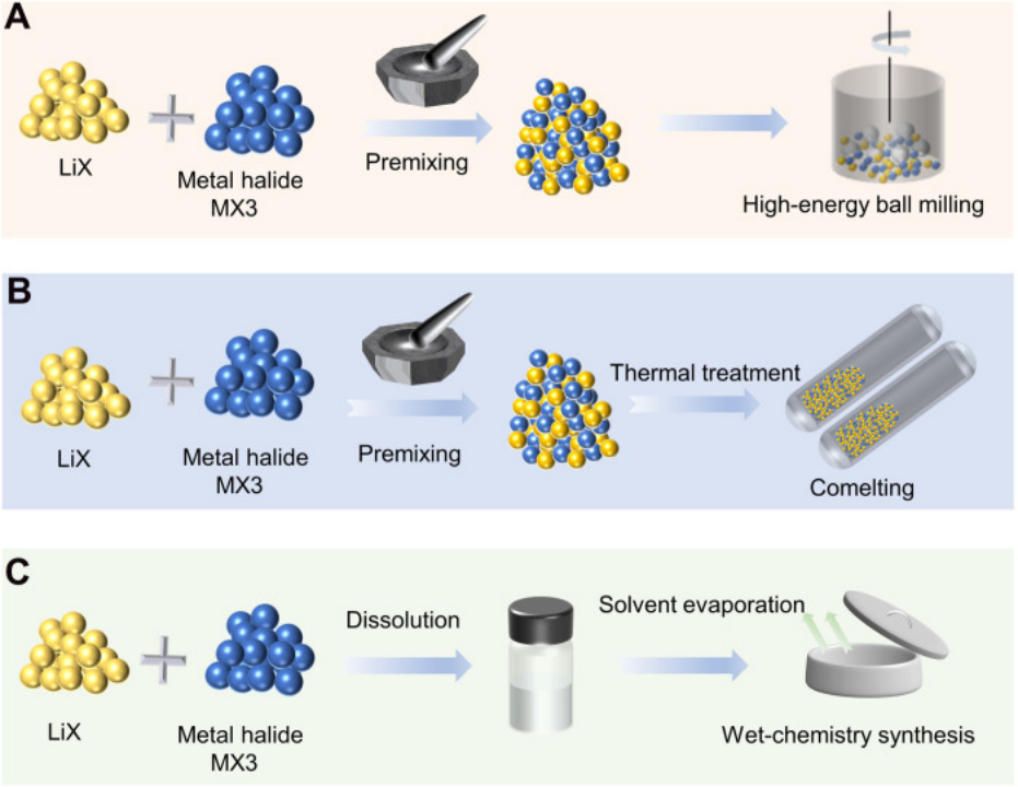 目前,當(dāng)前鹵化物固態(tài)電解質(zhì)的合成主要采用機(jī)械混合球磨和高溫?zé)Y(jié)路徑,采用其他的合成方法,如液相合成、氣相沉積等,報(bào)道的相對(duì)較少。